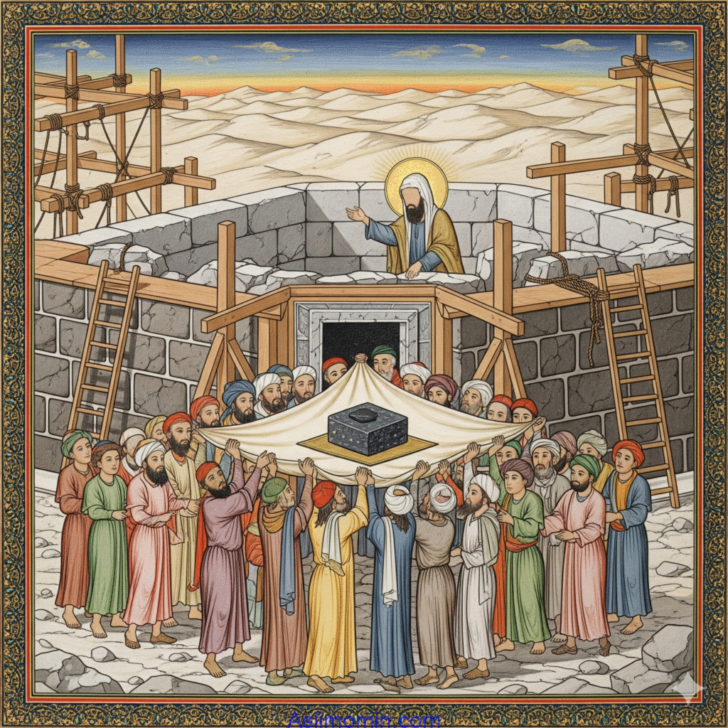 इसी पुनर्निर्माण के दौरान हज्र-ए-अस्वद (काला पत्थर) को दीवार में प्रतिष्ठित करने को लेकर विवाद हुआ। मोहम्मद ने एक चतुराईपूर्ण समाधान निकाला — उन्होंने एक कपड़े पर पत्थर रखवाया और सभी जनजातीय नेताओं से मिलकर उसे उठवाया, फिर स्वयं उसे दीवार में स्थापित किया।