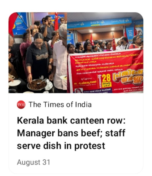 Recently, the canteen of Canara Bank in Kerala stopped serving beef.